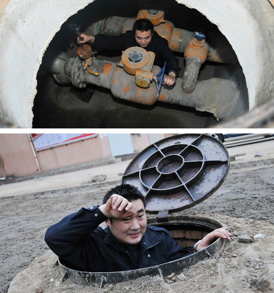 簡單的午餐過后,胡站長開始了閥門井的巡視工作。當(dāng)掀開位于濟陽大街的主管道井蓋時,一股熱浪襲來。“井內(nèi)溫度達到46度,到這里面就如同洗桑拿浴”胡站長開玩笑說。等他從6米多深的管道井中上來時,一頭的汗水。大的管道井雖然熱,但是內(nèi)部空間比較大,維修保養(yǎng)還比較容易,眾多小區(qū)開發(fā)商自行建設(shè)的小管道井才是工作中的挑戰(zhàn),空間狹小,工作人員只能用特殊地體位更換閥門。