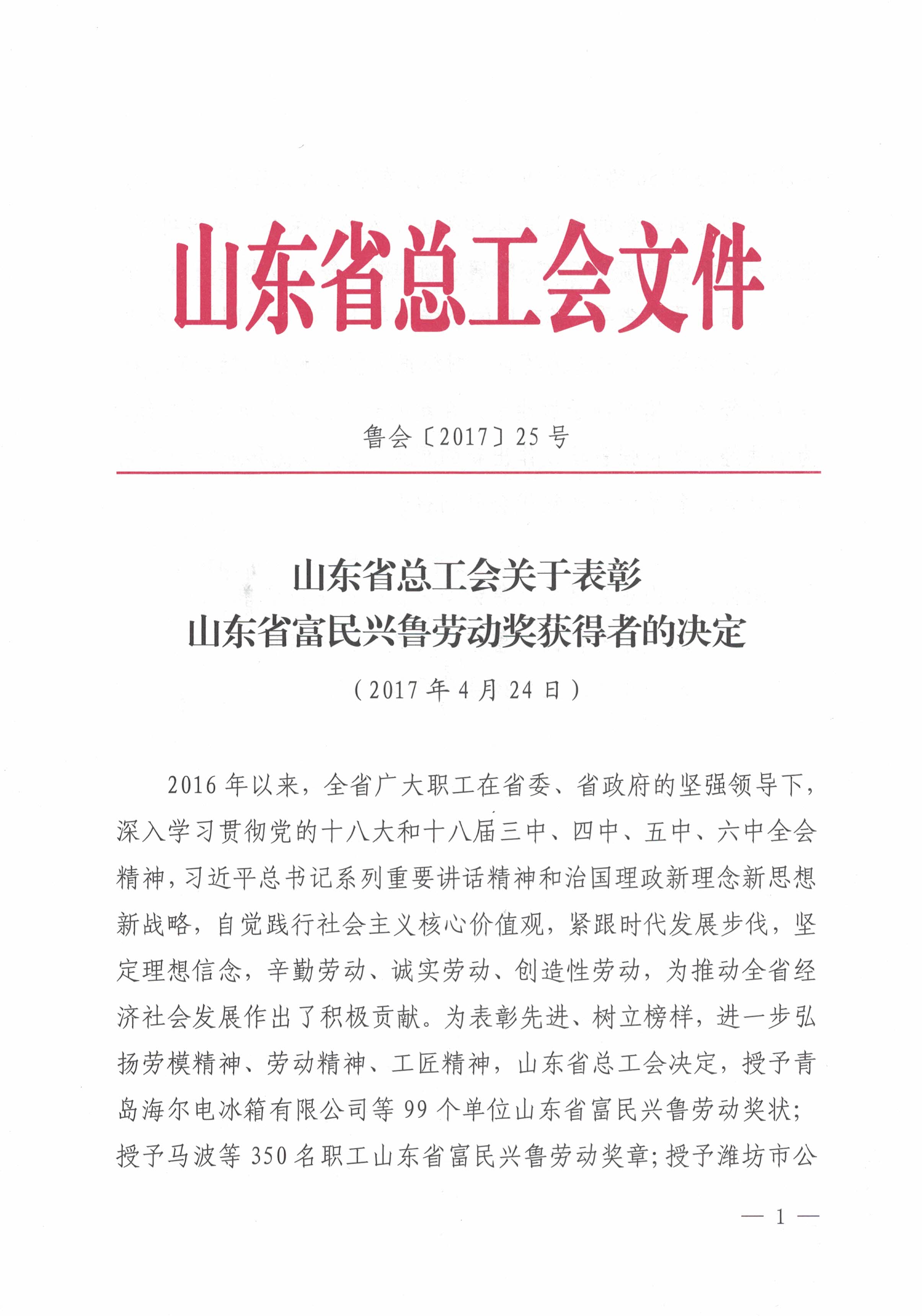 據(jù)了解,“富民興魯勞動(dòng)獎(jiǎng)狀”是山東省總工會(huì)組織評選的先進(jìn)集體獎(jiǎng)項(xiàng),旨在激發(fā)各單位自覺踐行社會(huì)主義核心價(jià)值觀,緊跟時(shí)代發(fā)展步伐,堅(jiān)定理想信念,辛勤勞動(dòng)、誠實(shí)勞動(dòng)、創(chuàng)造性勞動(dòng),為推動(dòng)全省經(jīng)濟(jì)社會(huì)發(fā)展作出積極貢獻(xiàn),最終為實(shí)現(xiàn)“十三五”規(guī)劃目標(biāo)任務(wù)和全面建成小康社會(huì)建功立業(yè)。