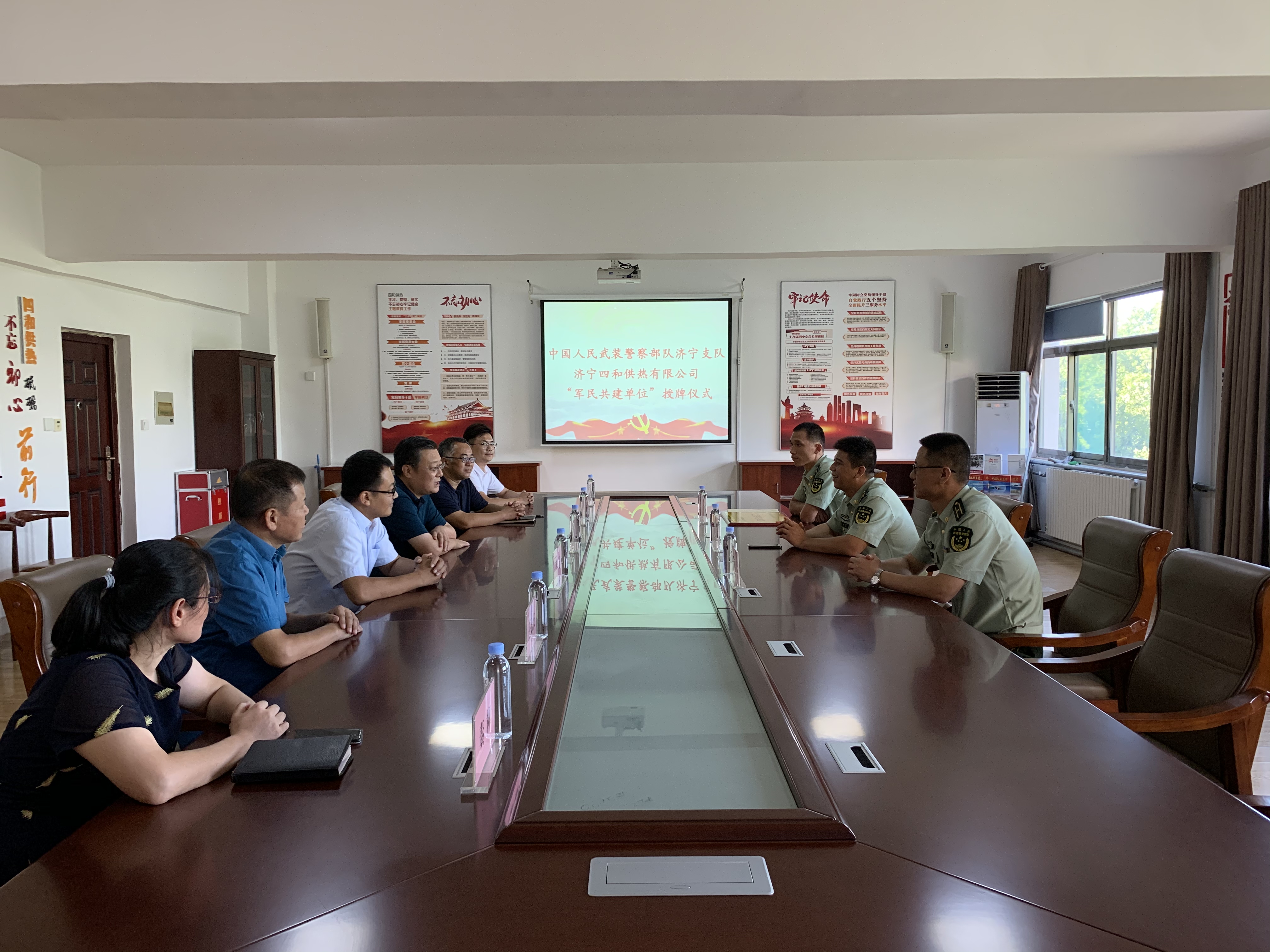 為進一步加強軍民融合,大力弘揚“軍愛民,民擁軍”的優(yōu)良傳統(tǒng),2020年9月3日下午,濟寧四和供熱有限公司與中國人民武裝警察部隊濟寧支隊“軍民共建單位”授牌儀式在公司四樓會議室舉行,標志著四和供熱公司與中國人民武裝警察部隊濟寧支隊軍民共建系列活動正式拉開了帷幕。四和供熱公司領(lǐng)導(dǎo)班子及相關(guān)部室負責(zé)人、濟寧武警支隊政委唐衛(wèi)洋一行出席授牌儀式。