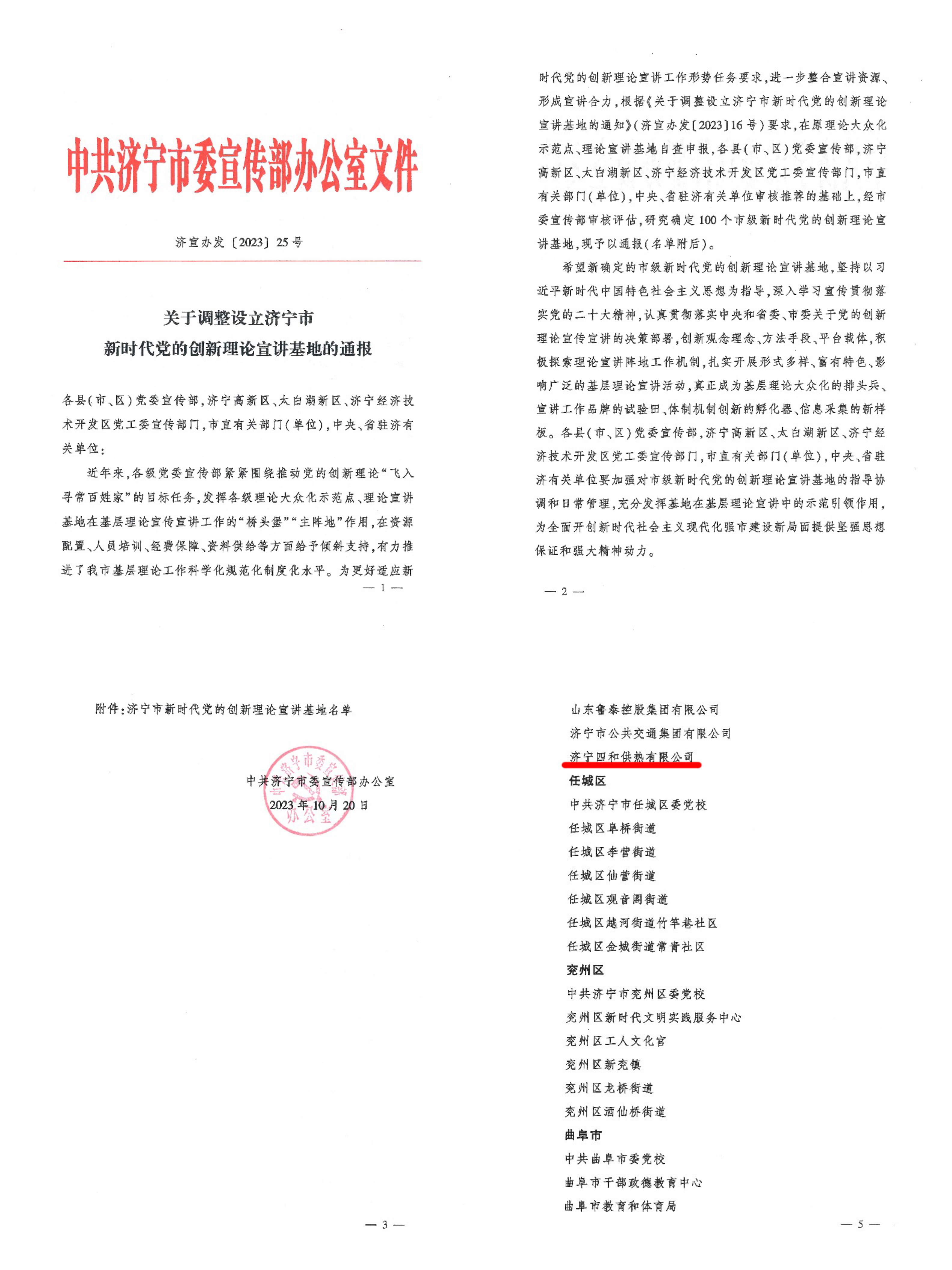 近日,中共濟寧市委宣傳部辦公室下發(fā)了《關于調整設立濟寧市新時代黨的創(chuàng)新理論宣講基地的通報》,對100個市級新時代黨的創(chuàng)新理論宣講基地予以公布。其中,濟寧四和供熱有限公司獲評“濟寧市新時代黨的創(chuàng)新理論宣講基地”。